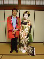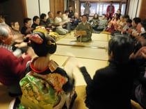 1曲舞った後、舞妓さんのお着物の話(だらりの帯や襟のことなど)をお話しいただき、また1曲舞っていただいた後は、いよいよ皆様とともにお座敷あそび。「金毘羅ふねふね」で盛り上がり、また皆さん車座になってのあそびなど、これまで体験したことのないお座敷あそびに皆さん大喜び。基本、お座敷あそびは「負けたらお酒を飲む」。舞妓さん曰く、飲みたくてわざと負ける人もいるとか(笑)